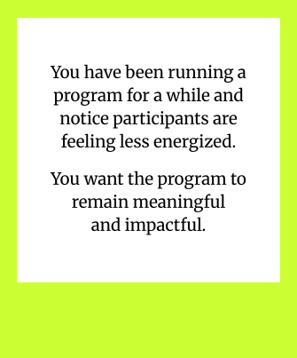 Could you benefit from a strategic stepback to align on your engagement goals? Are you looking to engage multiple perspectives across your organizations while bringing cohesion across your programmatic offerings? In this custom, half-day session for up to seven team members, we will facilitate your group to navigate complex engagement challenges, reimagine pathways forward, and create an implementation plan that actualizes your ideas